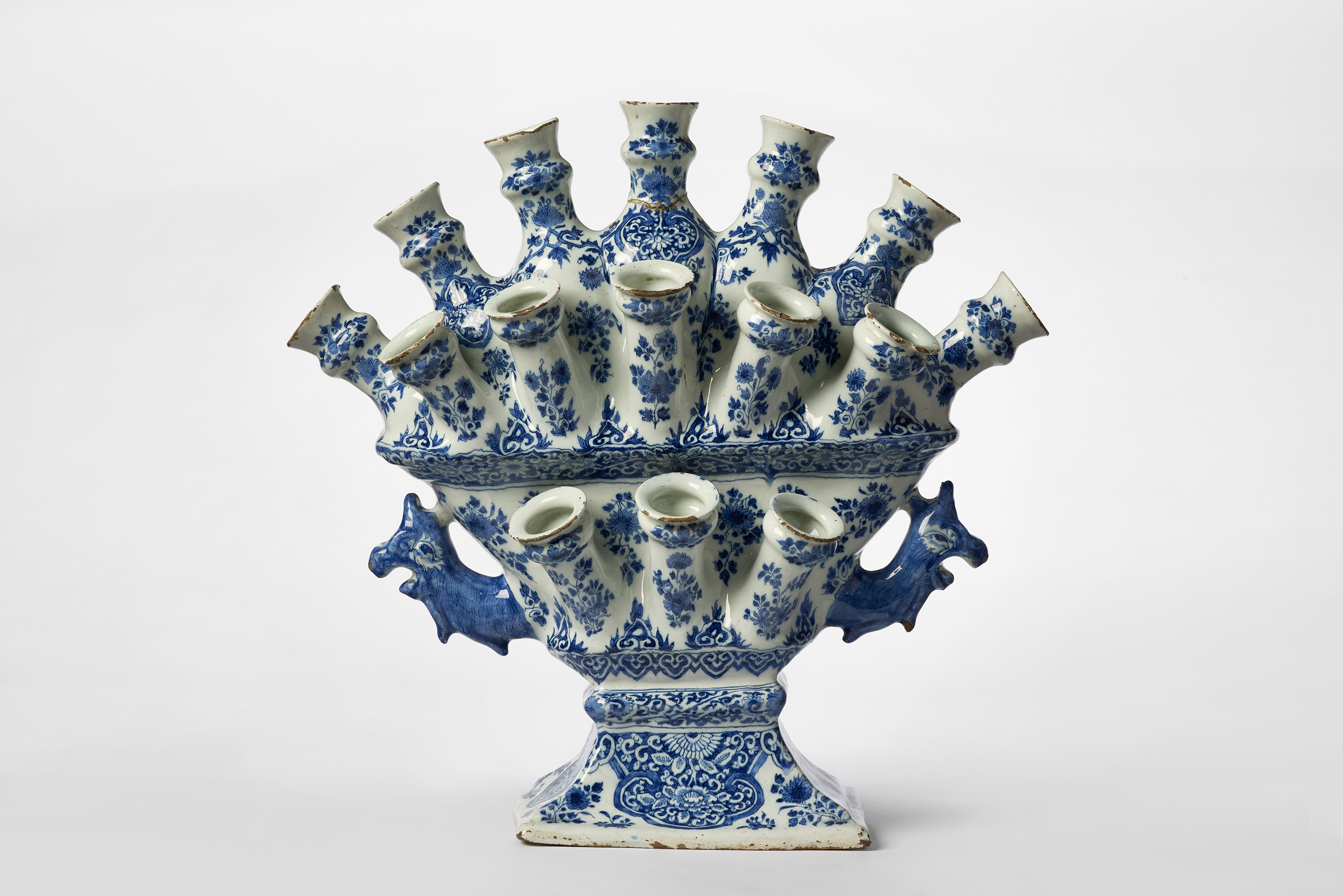 Before porcelain became commonplace, tin-glazed earthenware was, for a time, the preferred material for home use, produced as fashionable tableware and ornaments. The golden age of tin glaze products was the 1700s with more than 300 workshops throughout Europe. By the end of the century, tin glaze wares had practically been driven out by Chinese and European porcelain and the cheaper English creamware.