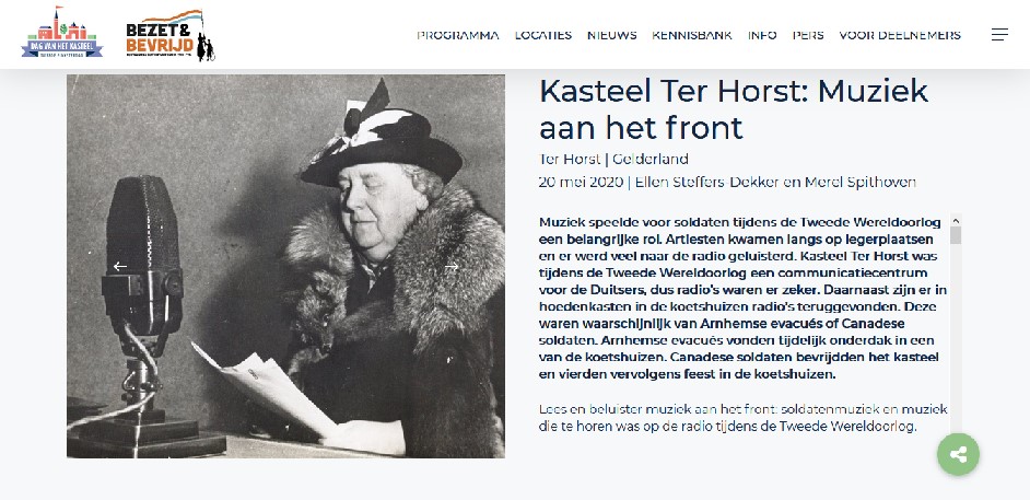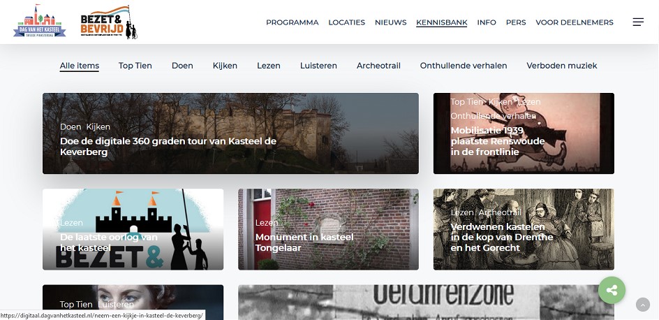 We came up with a new concept, a digital portal: digitaal.dagvanhetkasteel.nl. Here we gathered all the different stories and made them digitally accessible. In a few months’ time we created a digital database consisting of 98 ‘tiles’. Each tile contains a story and one or more appealing photo’s. We divided the content in ‘read’, ‘listen’, ‘watch’, ‘do’. The program consists of podcasts, guided walking and biking routes, interviews, a variety of short essays and beautiful, sometimes unique, footage. Visitors can browse the stories or select by category, our top ten or they can use the search option. We made tiles not only for our own program but also for the participating castles whom we asked to send in their stories about WWII. To mark the day itself and the ‘grand opening’ of the digital portal, we selected five stories that we presented as a premiere on the day itself.