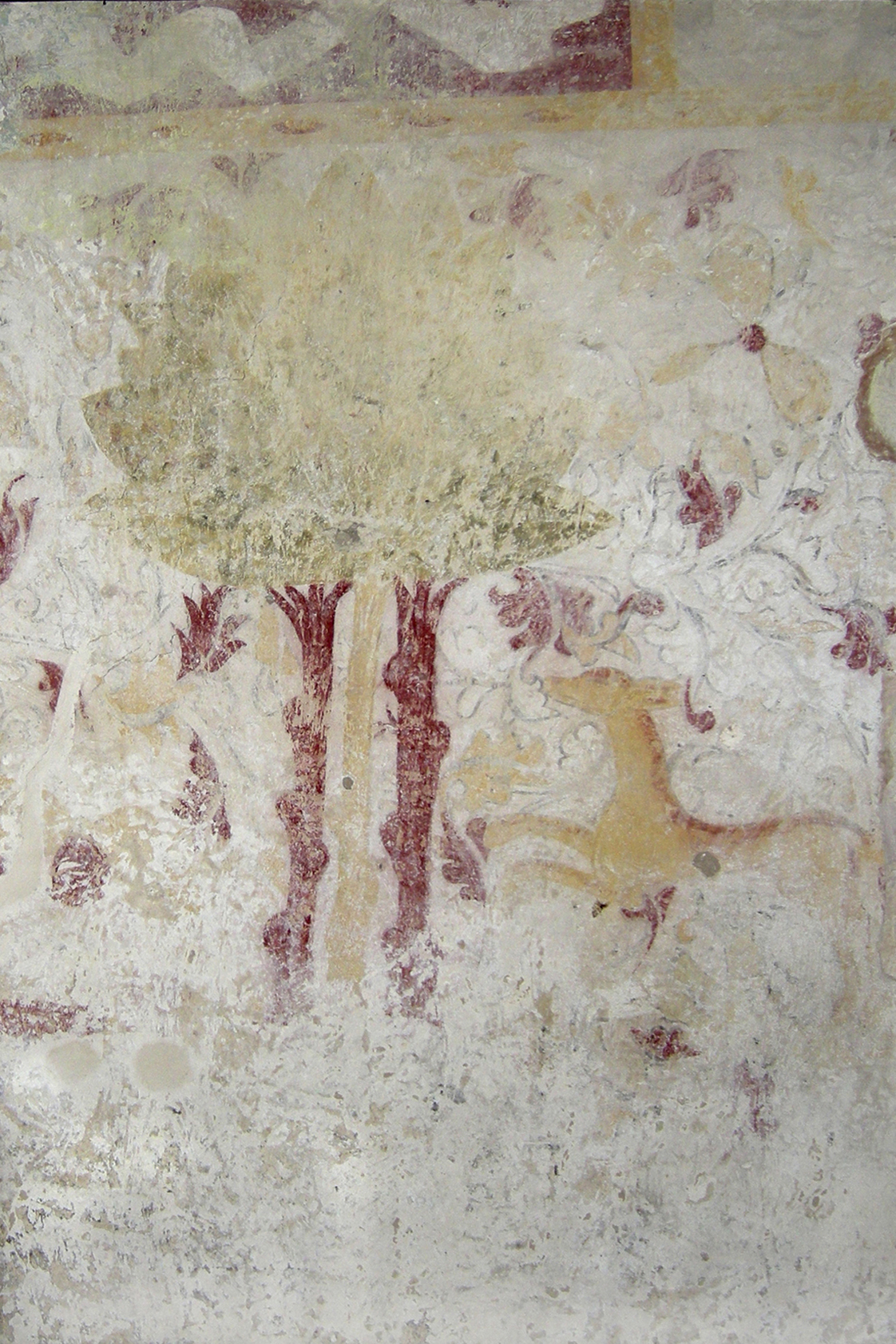 Architectural historian Sir Nikolaus Pevsner (and other eminent scholars of the day) described the early 16th-century wall paintings in the house upper rooms as “a rare English interpretation of French verdure tapestries.” The wall paintings dated around 1500 are said to be, “the most complete, extensive, and important domestic decoration of this date in the country.” As of December 2019, I have deciphered the images to find early Christian symbols and currently I am collaborating with three competent PhDs in that field of study to corroborate my findings, which appears to take us on a pilgrim’s trail through Burgundy, France. However, if others wish to be involved, we look forward to hearing from you. We are dealing with a massive and exciting project that will bring more clarity to Europe’s history.