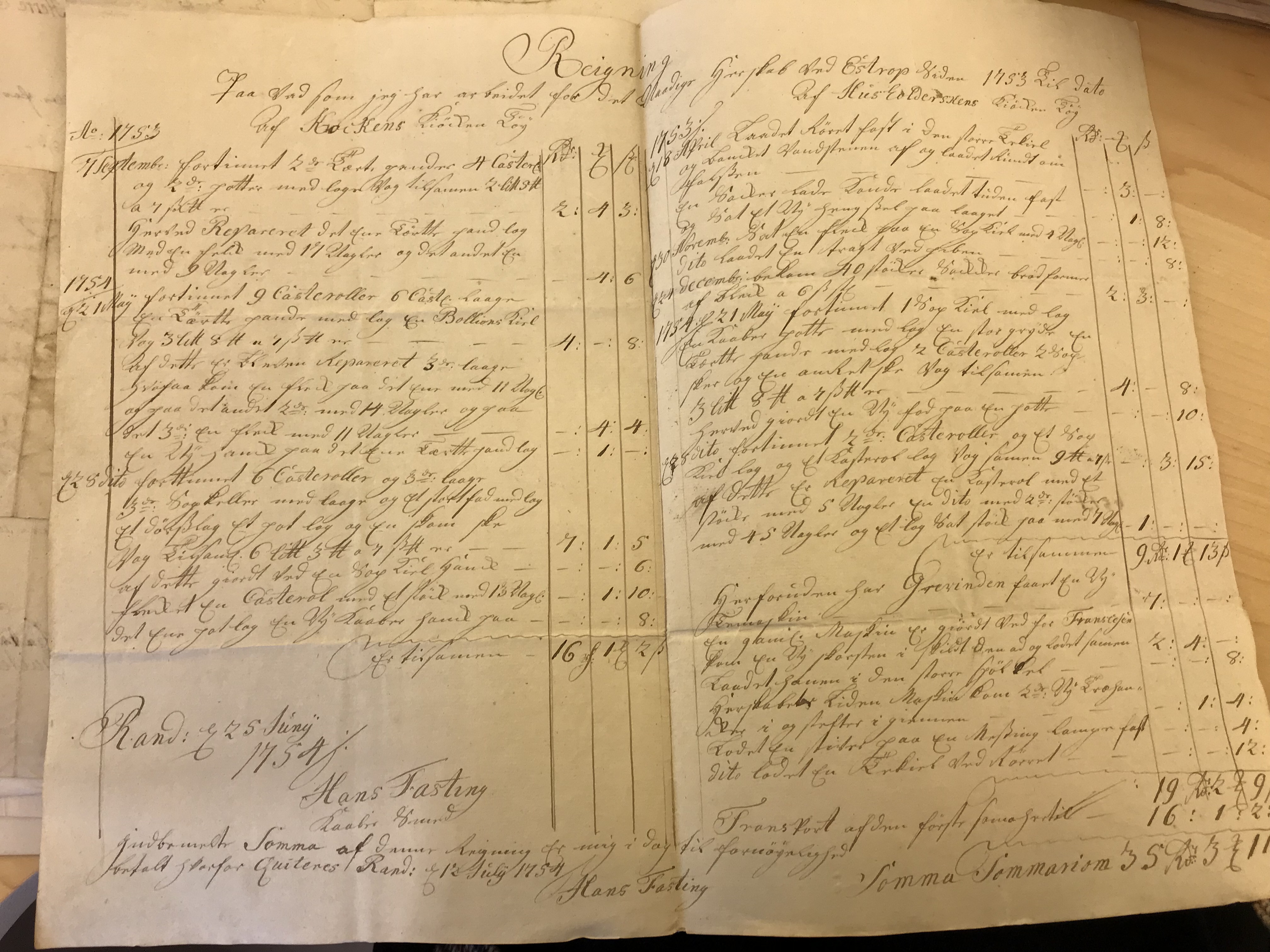 Bill for the repair of copper kitchenware. Signed by coppersmith Hans Fasting, Randers, 11 July 1752. Gammel Estrup Estate Archives.