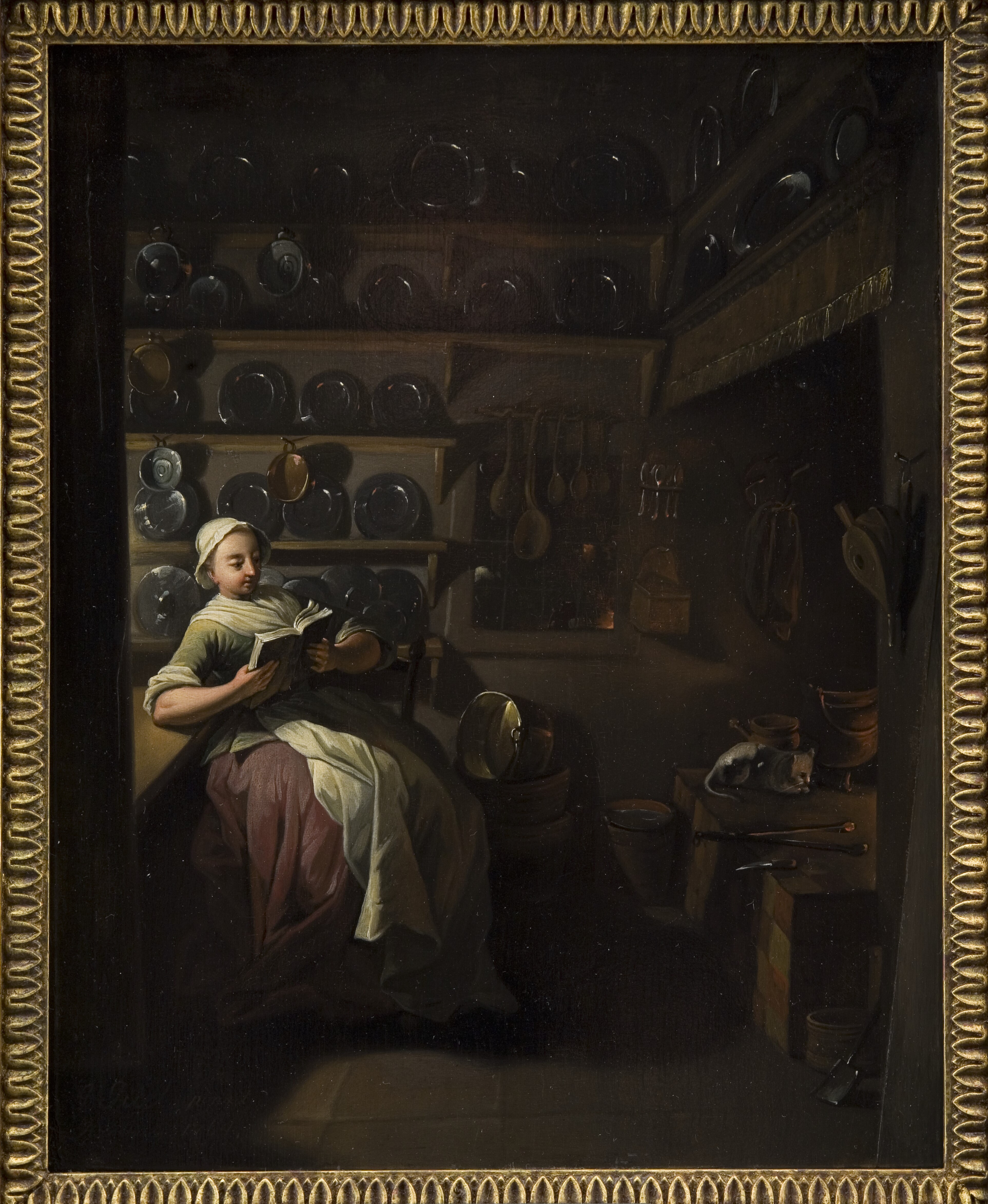 Kitchen interior with girl reading, by Jens juel, 1764. SMK