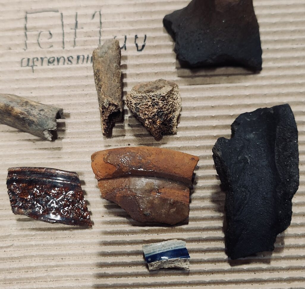 Following these initial observations and the registration of various contexts on site, students began the process of excavating the contexts and recording finds. A myriad of fascinating artefacts and ecofacts have reached the finds table. Pottery shards range from the Iron Age to the Renaissance. Equine remains have also been found, as well as hooks, nails, slag and other scraps of iron. The wealth and diversity of finds reflect the long period of habitation recorded in historical sources. Some artefacts show that this field has been in use before the 1300s, for instance, shards of “Østersøkeramik” have been found, which is a type of pottery dating from the 11th to the 13th century. Some of these findings can be seen in Figure 3 below. In the coming weeks, the excavation will continue, and the students involved anticipate literally and figuratively uncovering the history of “Højby Voldsted.”