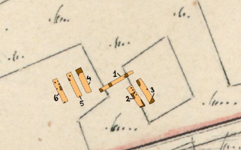 Figure 1: Cadastral map from 1789 with trenches represented in QGIS