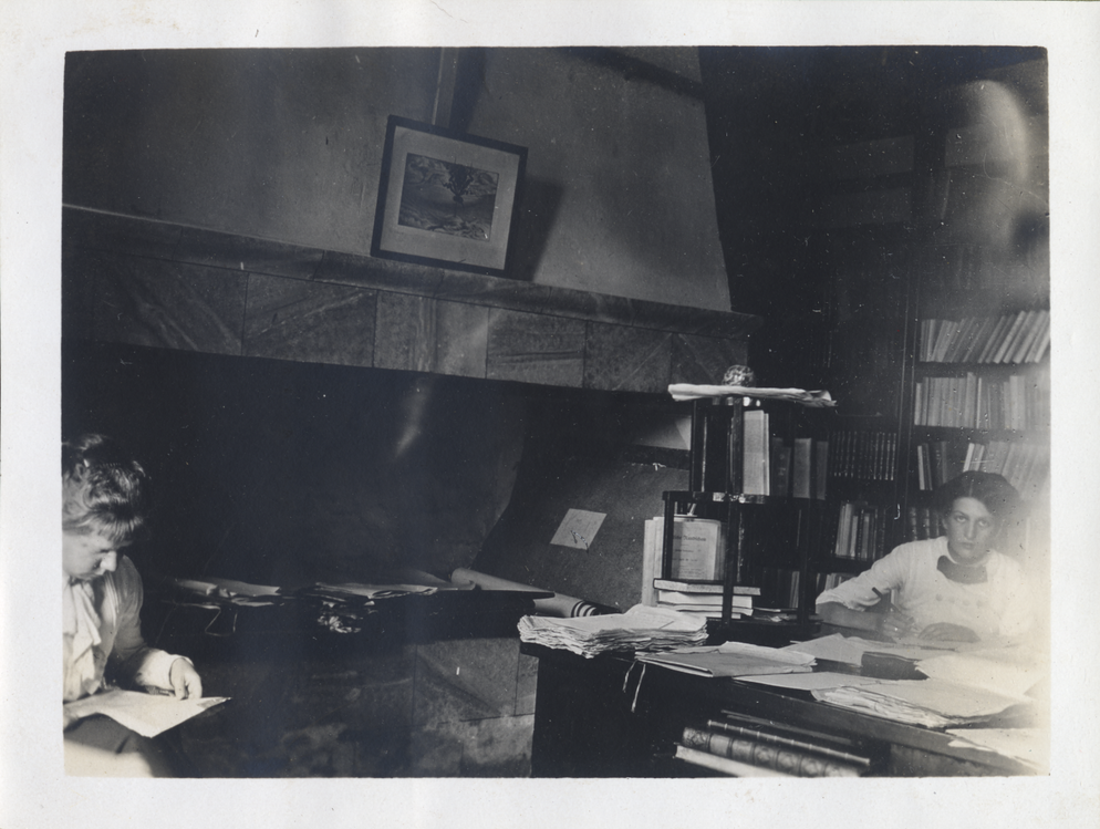 Two of Söderhjelm’s collaborators, Countess Thyra Klinckowström (left) and Miss Tyra Linder (right), working on the manuscripts at the Stafsund country estate. Photo by Alma Söderhjelm. Åbo Akademis bibliotek, Alma Söderhjelms samling, Bildsamlingen.
