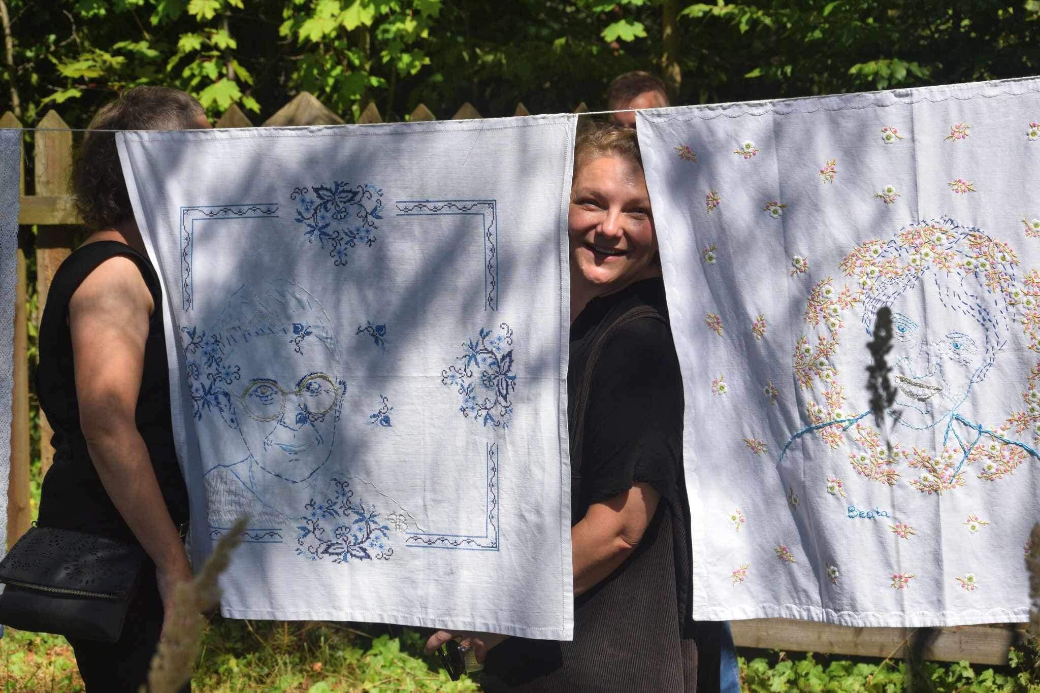 Then on the National Armed Forces Day on the 15th of August we hung them up, as women hang washed clothes on lines to dry them – and people gathered. We used the special “marginal space” on the borderline of the historical museum compounds and of the Milusin Manor house. The performance was a wonderful testimony of time spent together, talking, and sewing. And using the space in-between, at the margins, the off-the limits seemed symbolical – as a way to make the work and history of women and sisterhood visible.