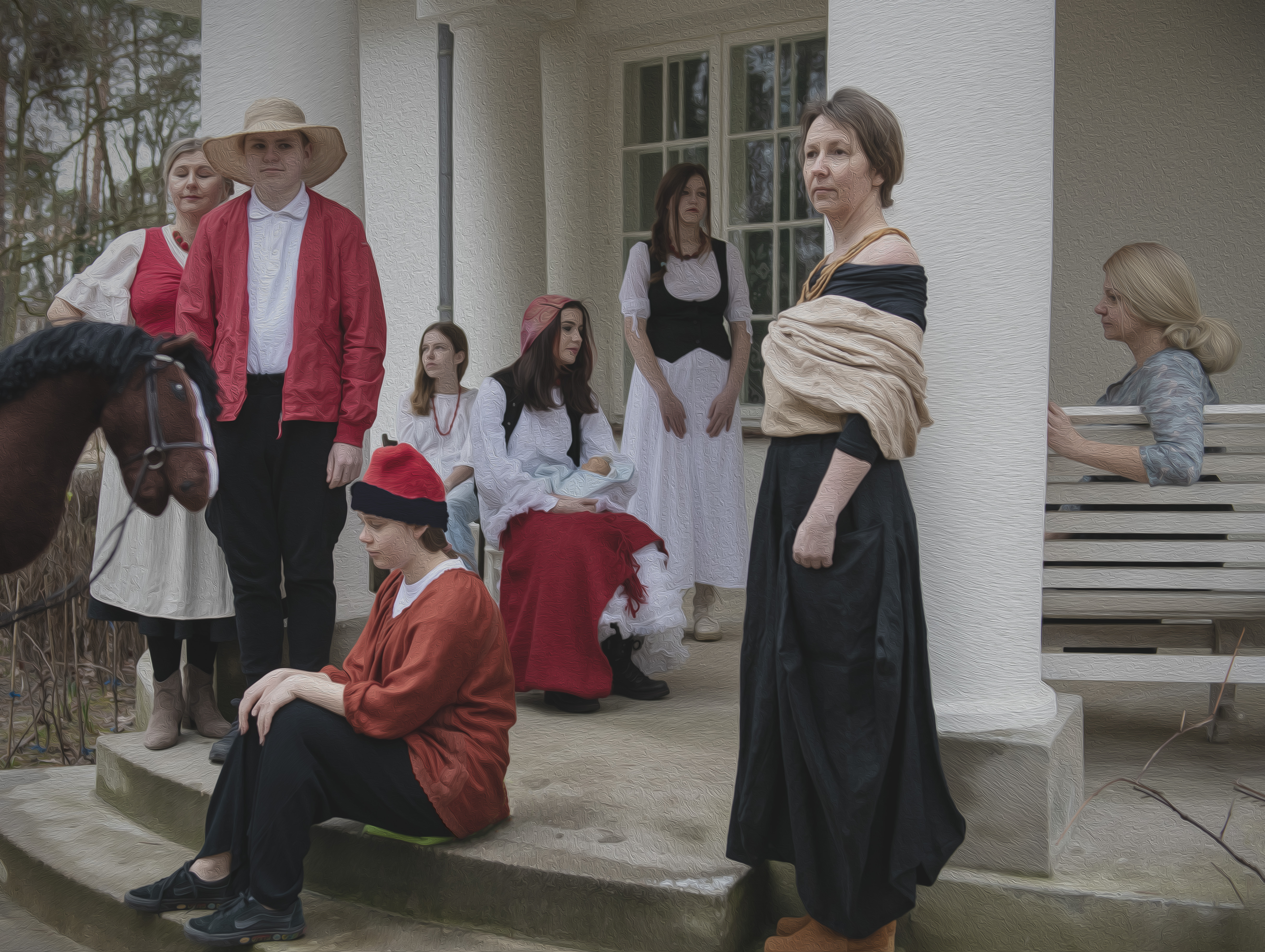 In cooperation with the Historical Museum of Kraków City we celebrated the Year of Włodzimierz Tetmajer, a prominent artist who died a century ago – a painter and stage designer working mostly in the art deco style typical to Kraków and the Austro-Hungarian Empire at that time. Together with our volunteers we chose one of his pieces. Then we created a tableau vivant: First, we carefully studied the picture, then we chose the exact place and clothes – then we had great fun arranging our volunteers. “On the Porch” is the title of the original painting which depicts several people at the porch of the manor Dworek Włodzimierza Tetmajera in Kraków. But we met with our volunteers at the porch of our Milusin Manor House to recreate a contemporary version of Tetmajer’s scene here.